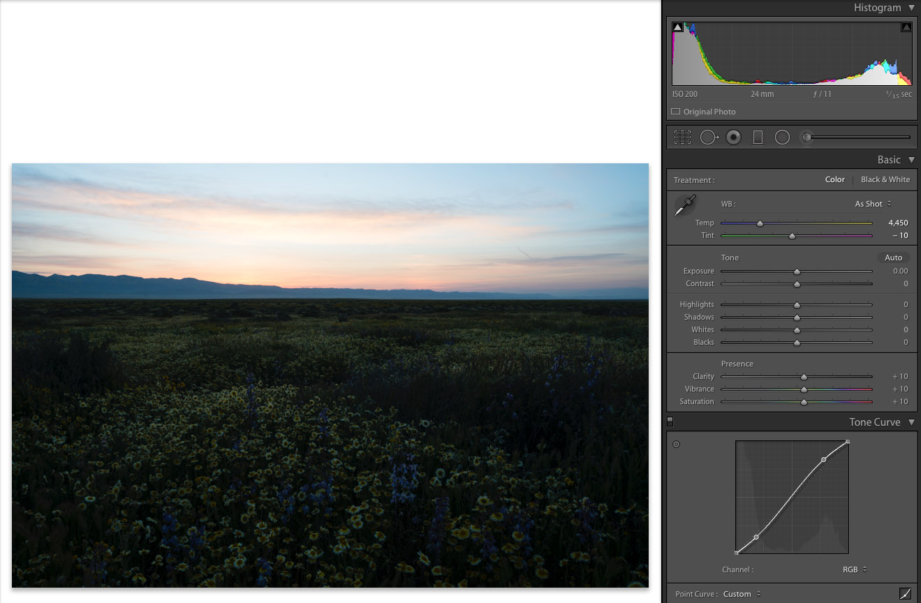 The second image is from a sunrise on the Carrizo Plain. I wanted to convey the impression of standing in a rich carpet of wildflowers stretching as far as the eye can see towards the horizon in a vast valley. I shot a Canon TSE-E 24mm II on a Sony A7R2 with Metabones adapter. The TSE-E lens has a tilt control analogous to that of a large format camera which allows to keep both foreground and background in sharp focus while using a moderate f/stop. The exposure was 1/15 sec at f/11, ISO 200.Here is the raw file, with the same default adjustments as before applied. The image looks dark because it was exposed to preserve all the light information in the scene rather than attempting to be faithful to it. As you can see in the histogram, the highlights are not clipped, and shadow clipping is minimal. With my other cameras such as the Canon EOS 5Dmk3, brightening the shadows would have resulted in excessive levels of noise, so I would have resorted to blending two or more exposures. The Sony A7R2 easily captures all the dynamic range in a single frame, and my goal is to reduce the extreme contrast in the scene.