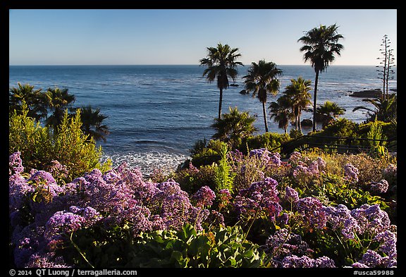 Flowers, palm trees, and ocean. Laguna Beach, Orange County, California, USA