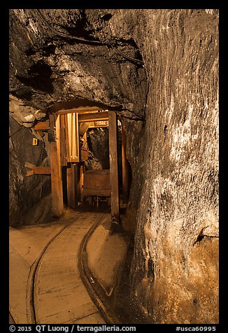 Gallery with tracks and ore car, Gold Bug Mine, Placerville. California, USA