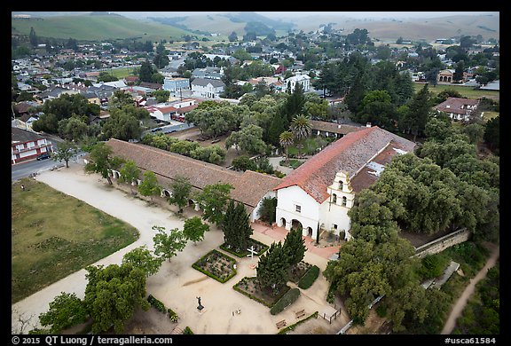 Aerial view of Mission San Juan and San Juan Bautista. San Juan Bautista, California, USA