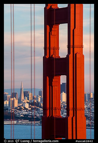 Golden Gate Bridge pillar and city skyline. San Francisco, California, USA