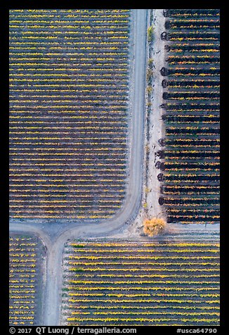 Aerial view of vineyards, tree and paths looking straight down. Livermore, California, USA