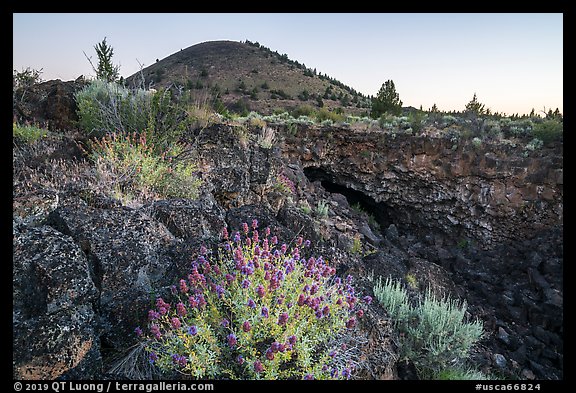 Wildflowers, entrance of Big Painted Cave, Schonchin Butte, dawn. Lava Beds National Monument, California, USA