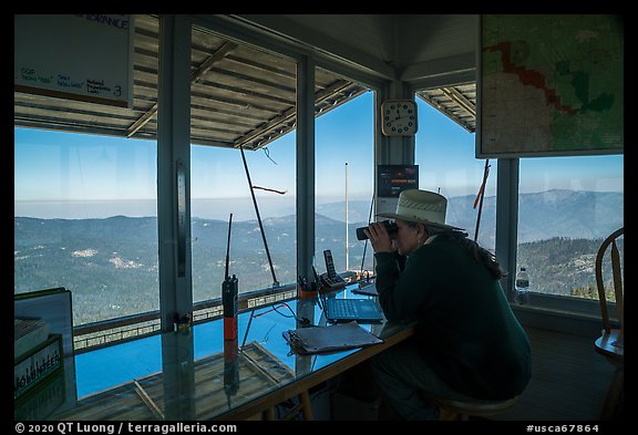 Fire lookout worker observing with binoculars. Giant Sequoia National Monument, Sequoia National Forest, California, USA