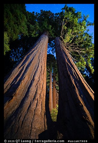 Sequoia trees seen between twin sequoias at night, McIntyre Grove. Giant Sequoia National Monument, Sequoia National Forest, California, USA