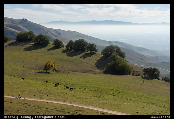 Trail, pasture with cows, Silicon Valley, Mission Peak Regional Preserve. California, USA