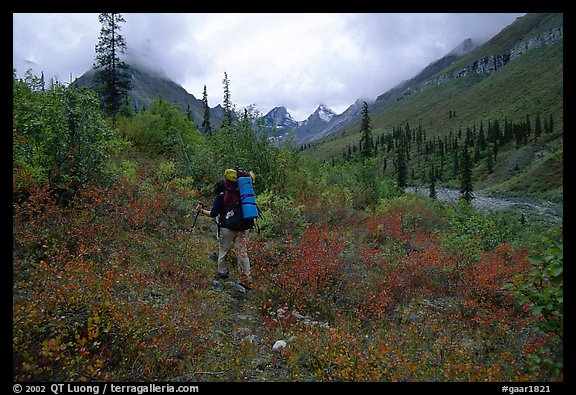 Backpacker in Arrigetch Creek. Gates of the Arctic National Park, Alaska