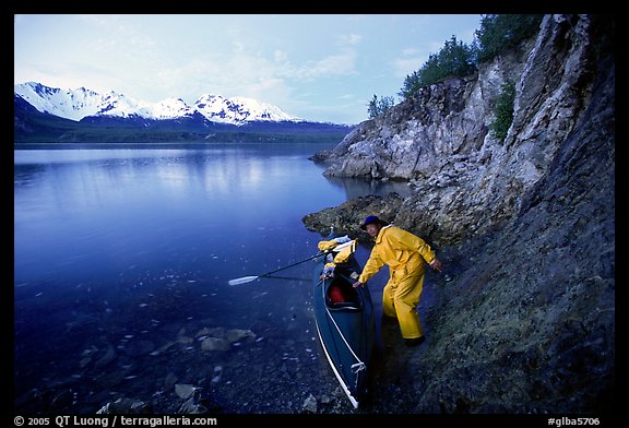 Kayaker pulling on shore at midnight, Muir Inlet. Glacier Bay National Park, Alaska