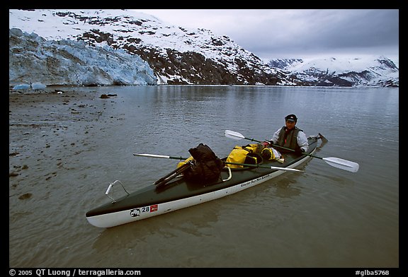 Kayaker sitting in loaded double kayak near Lamplugh Glacier. Glacier Bay National Park, Alaska