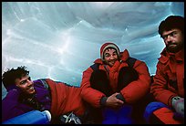 The main camp at 14300ft. Denali, Alaska ( color) The day when we arrived, the weather was great, and there is a large numbers of climbers going for it. Denali, Alaska ( color) Waiting out in bad weather. Denali, Alaska ( color) Fresh snow on the 14300ft camp. Denali, Alaska ( color) Fresh snow and sea of clouds on 14300ft camp. Denali, Alaska ( color) The ranger tent. They perform rescues and operate a medical camp, but also give tickets for littering. The two lattrines help keep the snow good for drinking. Denali, Alaska ( color) The low-profile tents have to be protected against the wind (which can reach 100mph). Climbers dig a hole and built thick snow-walls by sawing off large chunks of frozen snow. Denali, Alaska ( color) The ridge visible on the skyline is the West Rib, which was my planned itinerary. My companions had settled for the West Buttress, so I would do the second part of the climb solo. Denali, Alaska ( color) The temperatures during the day were pleasant, but within fifteen minutes after the sun has disappeared, they would drop down to subzero (F). This was a warm year, with minimum temperatures of -20F.. Denali, Alaska ( color) Midnight alpenglow on Mt Hunter, seen from the 14300ft on Mc Kinley. Denali, Alaska ( color) I leave by myself the camp for a summit attempt, taking a cut-off to the West Rib. The West Buttress route goes to the pass, through the steep wall, and is quite crowded. Denali, Alaska ( color) At the 16000 narrow camp on the Rib, there is just another party. Denali, Alaska ( color) Storm clouds approaching. Denali, Alaska ( color) Storm clouds approaching. Denali, Alaska ( color) Storm clouds approaching. Denali, Alaska ( color) More fresh snow on the tent down at 14300. Denali, Alaska ( color) Party with typical Alaskan backpacks. Denali, Alaska ( color) Building an igloo, which offers a very good weather protection.. Denali, Alaska ( color) Climbers inside an igloo. Denali, Alaska ( color) The 14300 camp has a very social, and international atmosphere. One could argue that it is hardly a wilderness experience since there are in permanence dozens of tents there during the short (May-June) climbing season. Denali, Alaska ( color)