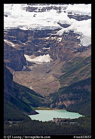 Lake Louise and Chateau Lake Louise at the base of Victorial Peak. Banff National Park, Canadian Rockies, Alberta, Canada