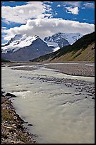 Peak and cloud near the Columbia Icefield,  early morning. Jasper National Park, Canadian Rockies, Alberta, Canada ( color) Wildflowers and  glacial pond at the base of the Athabasca Glacier. Jasper National Park, Canadian Rockies, Alberta, Canada ( color) Hanging glacier on Mount Athabasca. Jasper National Park, Canadian Rockies, Alberta, Canada ( color) Snow Dome Glacier, Snow Dome, and Mt Kitchener. Jasper National Park, Canadian Rockies, Alberta, Canada ( color) Multi-tiered Tangle Falls. Jasper National Park, Canadian Rockies, Alberta, Canada ( color) Tangle Falls and trees. Jasper National Park, Canadian Rockies, Alberta, Canada ( color) Tangle Falls. Jasper National Park, Canadian Rockies, Alberta, Canada ( color) Refecting pool near Beauty Creek, afternoon. Jasper National Park, Canadian Rockies, Alberta, Canada ( color) Wide Sunwapta River and Mt Athabasca, morning. Jasper National Park, Canadian Rockies, Alberta, Canada ( color) Curved Highway, Icefields Parway. Jasper National Park, Canadian Rockies, Alberta, Canada ( color) Cyclists on the Icefields Parkway in front of the Athabasca Glacier. Jasper National Park, Canadian Rockies, Alberta, Canada ( color) Cyclist with tow, Icefieds Parkway. Jasper National Park, Canadian Rockies, Alberta, Canada ( color) Woman cyclist, Icefieds Parkway. Jasper National Park, Canadian Rockies, Alberta, Canada ( color) Woman cycling the Icefields Parkway. Jasper National Park, Canadian Rockies, Alberta, Canada ( color) Couple cycling the Icefields Parkway. Jasper National Park, Canadian Rockies, Alberta, Canada ( color) Tourists lined up on Icefields Parkway to photograph wildlife. Jasper National Park, Canadian Rockies, Alberta, Canada ( color)