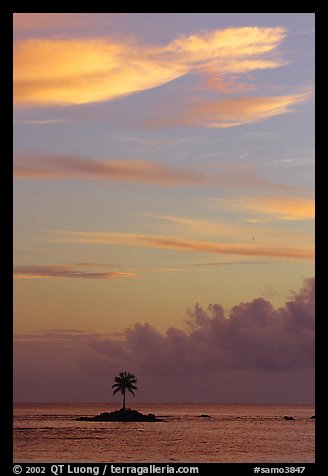 Lone coconut tree on islet in Leone Bay, sunset. Tutuila, American Samoa