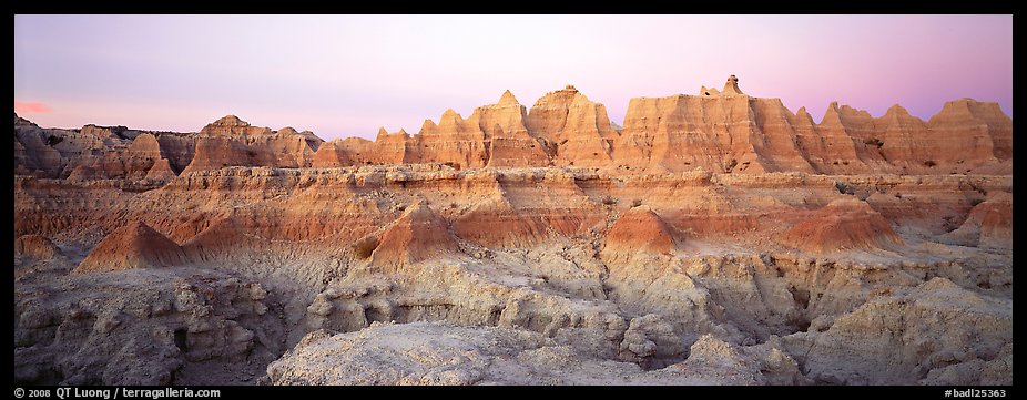 Badlands formations with pastel hues at dawn. Badlands National Park, South Dakota, USA. (Panoramic)