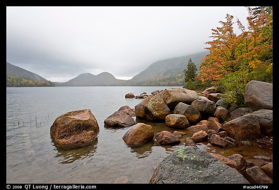 Boulders, autumn colors, and Bubbles, Jordan Pond. Acadia National Park, Maine, USA.