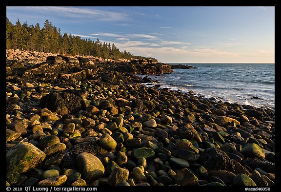Coastline with boulders, late afternoon, Schoodic Peninsula. Acadia National Park, Maine, USA.