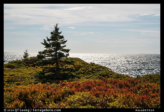 Autumn colors and shimmering sea, Little Moose Island. Acadia National Park, Maine, USA.