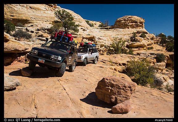 Vehicles on ledge in Teapot Canyon. Canyonlands National Park, Utah, USA.