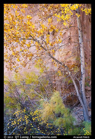 Tree and shrubs in autumn foliage against red cliff. Capitol Reef National Park, Utah, USA.