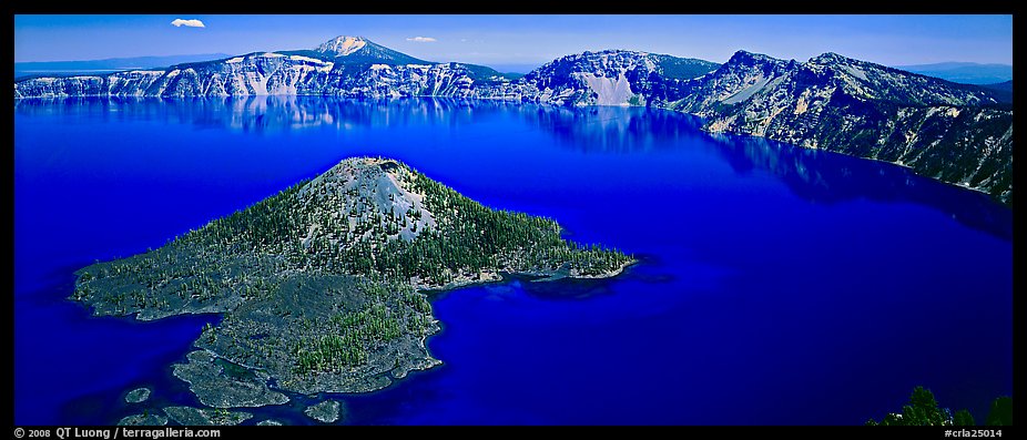 Blue lake and Wizard Island, morning. Crater Lake National Park, Oregon, USA. (Panoramic)