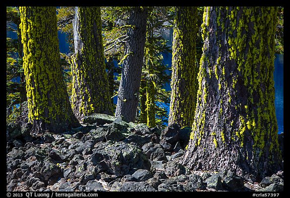 Lava rocks and Western Hemlock trees with lichen, Wizard Island. Crater Lake National Park, Oregon, USA.