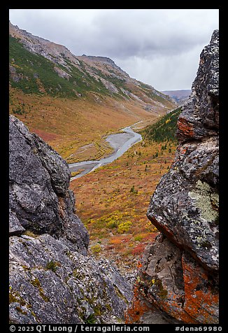 Savage River Valley through opening between rocks. Denali National Park, Alaska, USA.