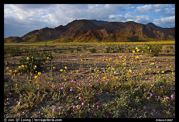 Wildflowers and Black Mountains below Jubilee Pass, late afternoon. Death Valley National Park, California, USA.