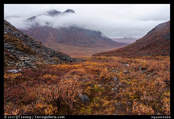 Autumn tundra and Kollutuk Mountain with low rain clouds. Gates of the Arctic National Park, Alaska, USA.