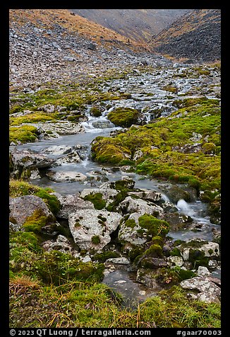 Stream flowing through rocks and mosses. Gates of the Arctic National Park, Alaska, USA.