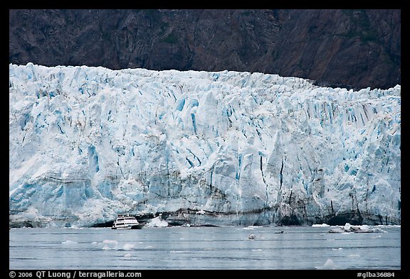 Small tour boat dwarfed by Margerie Glacier. Glacier Bay National Park, Alaska, USA.