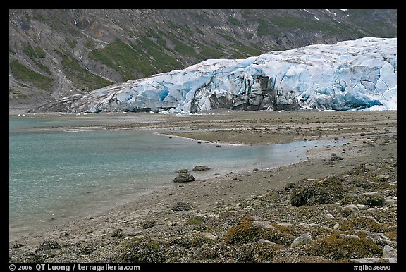 Beach and Reid Glacier. Glacier Bay National Park, Alaska, USA.