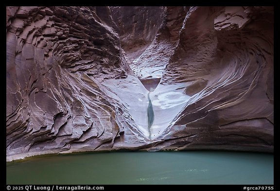 The sculpted pour-off at the end of North Canyon above a green pool in a dry year. Grand Canyon National Park, Arizona, USA.