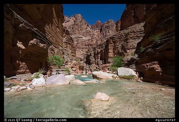 Clear water pools beneath cliffs near the mouth of Havasu Creek. Grand Canyon National Park, Arizona, USA.