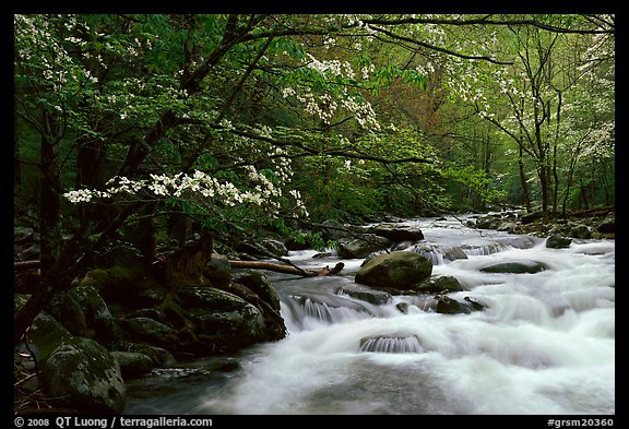 Stream with rapids and dogwoods in spring, Treemont, Tennessee. Great Smoky Mountains National Park, USA.