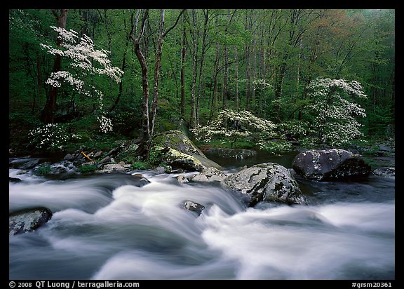 Three dogwoods with blossoms, boulders, flowing water, Middle Prong of the Little River, Tennessee. Great Smoky Mountains National Park, USA.