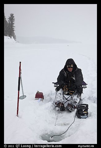 Ice fisherman with lounge chair and radar,Jackson Lake. Grand Teton National Park, Wyoming, USA.