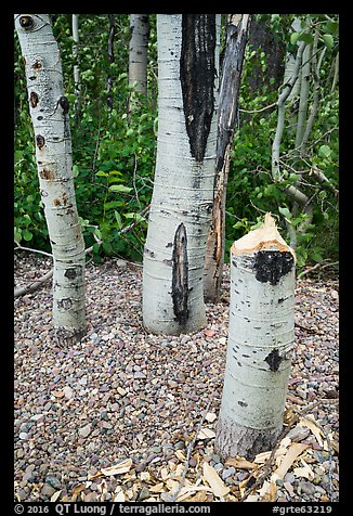 Aspen tree chewed and downed by beavers. Grand Teton National Park, Wyoming, USA.