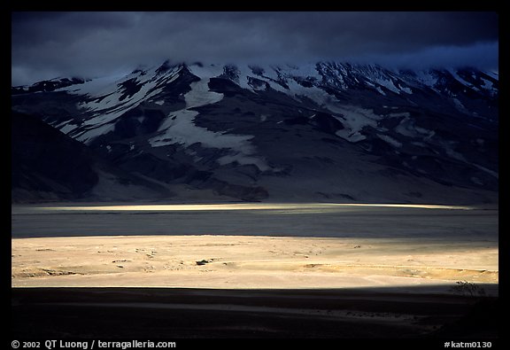 A break in the clouds illuminate the floor of the Valley of Ten Thousand smokes. Katmai National Park, Alaska, USA.