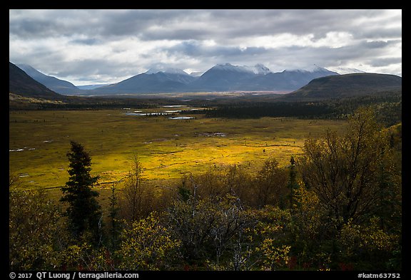 Shaft of light over tundra meadow downstream of Valley of Ten Thousand Smokes. Katmai National Park, Alaska, USA.