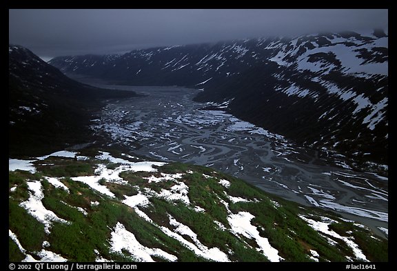Aerial view of Tikakila River valley under dark clouds. Lake Clark National Park, Alaska, USA.
