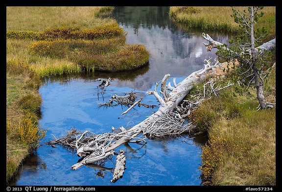 Fallen tree in Kings Creek with Lassen Peak reflection. Lassen Volcanic National Park, California, USA.