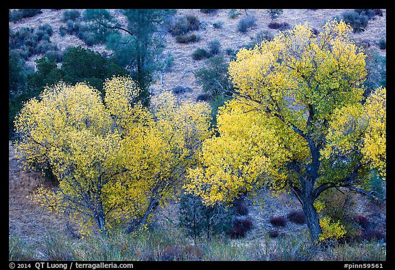 Cottonwoods in autumn at the bases of hill. Pinnacles National Park, California, USA.