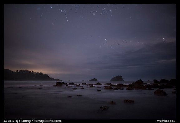 Rocks and seastacks at night, False Klamath Cove. Redwood National Park, California, USA.
