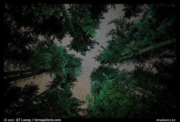 Looking up redwood trees at night, Jedediah Smith Redwoods State Park. Redwood National Park, California, USA.