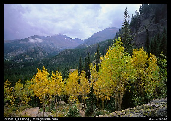 Aspens in fall foliage and Glacier basin mountains. Rocky Mountain National Park, Colorado, USA.
