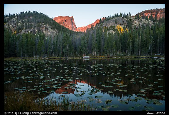 Hallet Peak above Nymph Lake at sunrise. Rocky Mountain National Park, Colorado, USA.