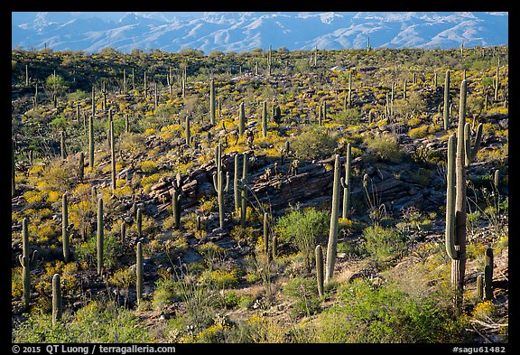 Cactus and brittlebush on a flat, Rincon Mountain District. Saguaro National Park, Arizona, USA.