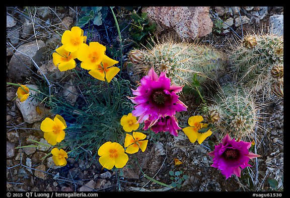 Close-up of hedgehodge cactus in bloom and poppies. Saguaro National Park, Arizona, USA.