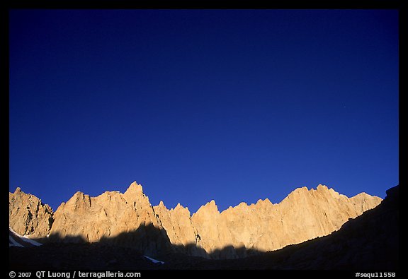 Mt Whitney range at sunrise and blue sky. Sequoia National Park, California, USA.