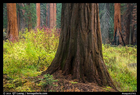 Sequoia trees bordering meadow in autumn, Giant Forest. Sequoia National Park, California, USA.